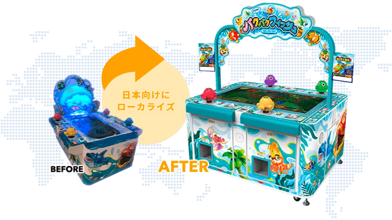 言語を日本語化するだけではなく、日本の法令に準じた改造を行うほか、より日本のユーザーに楽しんでもらえるよう、遊戯文化の違いにも着目した改造を施します。